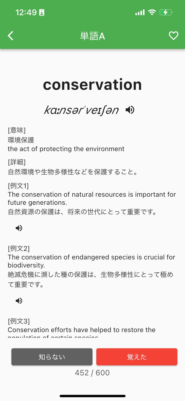 また、アプリは実践的な学習をサポートします。各単語には、複数の例文が提供され、その単語がどのように使われるかを理解するのに役立ちます。さらに、覚えた単語はマークして表示されなくする機能も搭載しており、効率的な復習が可能です。
