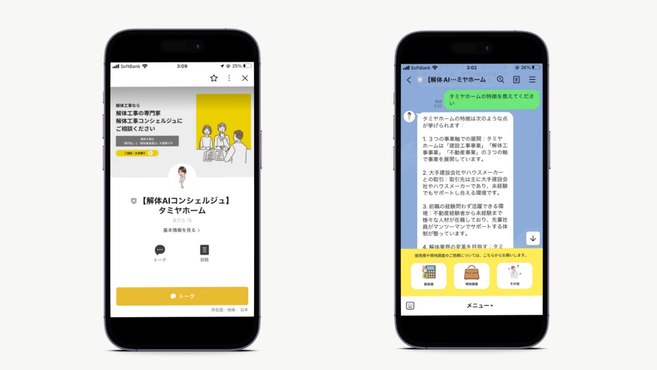 AIチャットボットが解体工事に関する質問に24時間365日対応! 設立26周年を迎えたタミヤホームが、2つの新サービスをスタート。