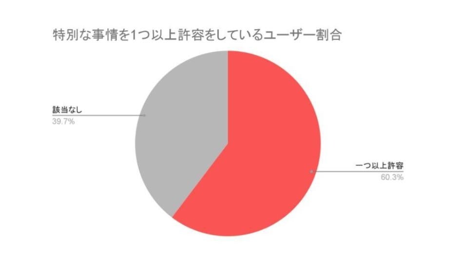 もう1つの指標はカミングアウトなどを伴う特別な事情について1つ以上許容を示しているユーザーが約60.3%いることです。特別な事情は、なんらかの疾患・特性(脱毛症・吃音等)やシングルマザーなどの社会的事情を抱えるユーザーが登録します。