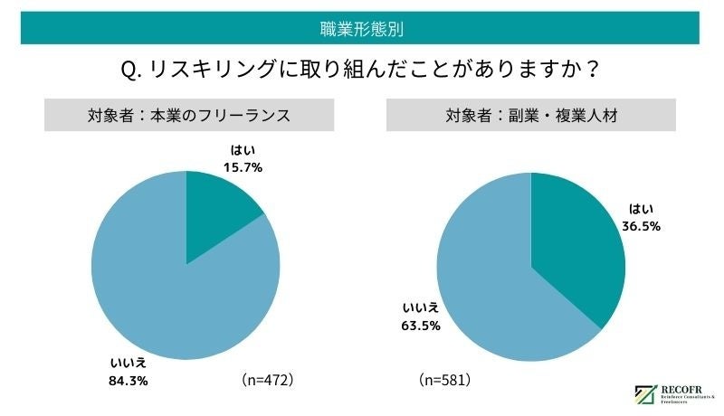 職業形態別で比較すると、本業のフリーランスは15.7%、副業や複業のフリーランスは36.5%がリスキリングを実施しており、特に副業・複業人材のリスキリングへの意識の高さがうかがえる結果となりました。