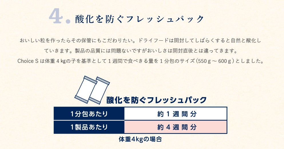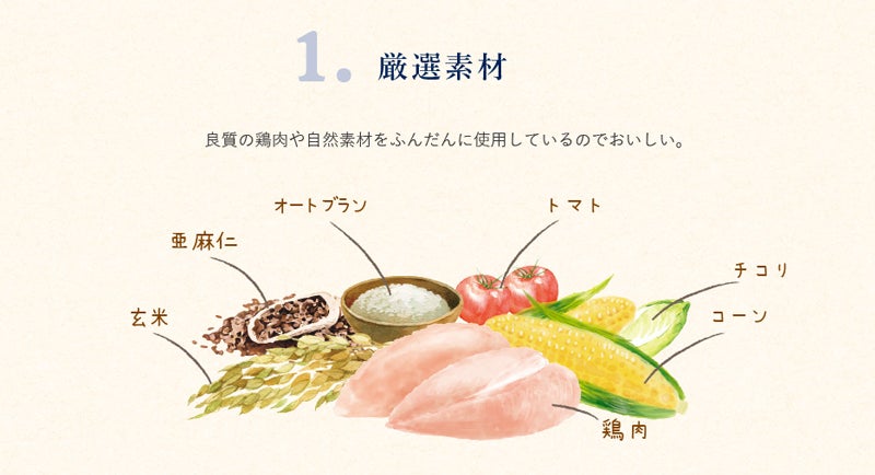 カラダよろこぶ厳選素材・・・愛犬が健康に暮らしていくために大切なのは毎日の食事です。健康なカラダを維持していくのに食事選びは大切です。Choice Sは厳選素材にこだわり、良質の鶏肉を使用、自然素材をふんだんに使用した低脂肪のヘルシーフードです。