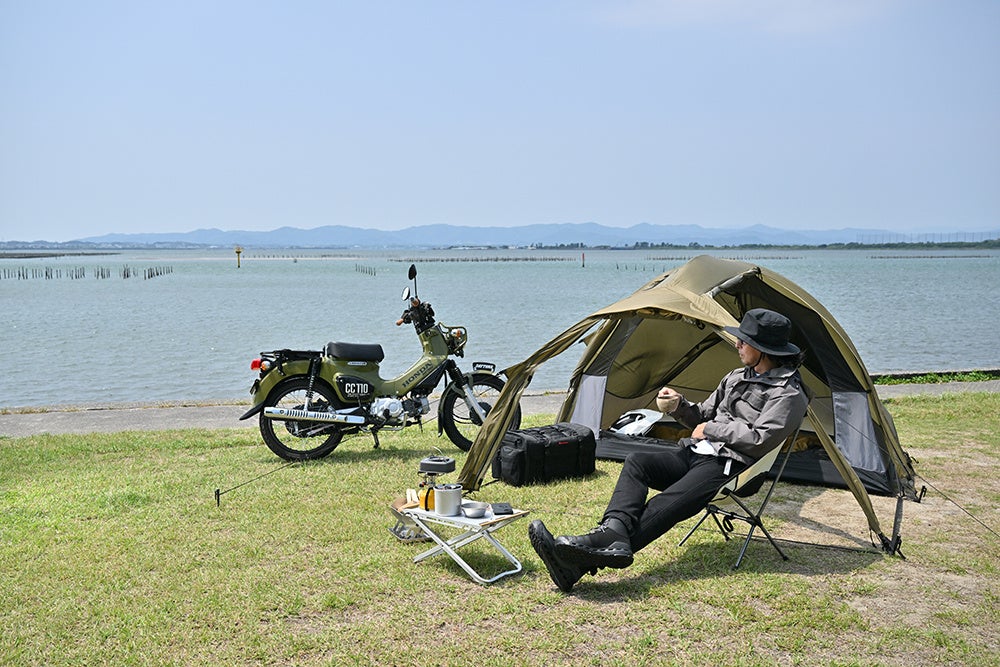 ライダーからするとテントが大きくて重さがあることや小さすぎて寝るのには窮屈など、バイクでキャンプする際に軽くて快適なテントがあまり多くない状況でした。その背景を考え「すべてがちょうどいい」をコンセプトに寝るスペースは狭く感じない十分な容量を確保することなど、ゆったりとした空間が特長のスタンダードなテントとしてバイク乗りならではのユニークな発想が詰まったテントにしたいと考え、生まれたのが「MAEHIROドーム(以下、マエヒロドーム)」です。