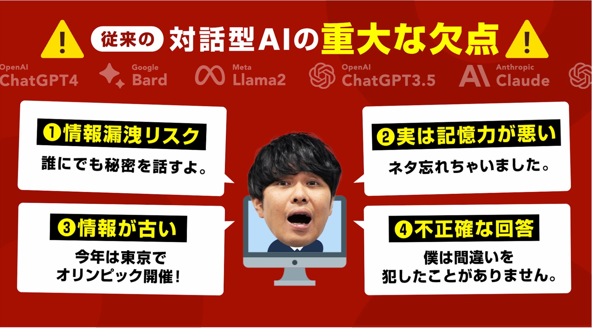 WEB広告では、さらば青春の光の東ブクロさんがスキャンダル(架空)により解雇が決定。その後、森田さんは従来の対話型AIと新たなコンビを組んでネタを披露し、順調に進んでいました。しかし、従来の対話AIが抱える問題点である記憶力の弱さや情報漏洩リスクの問題により、大きな困難に直面しました。そこで、AiBCを導入することで弱点を克服し、新しいコンビが成功するというユーモラスな広告が展開されています。
