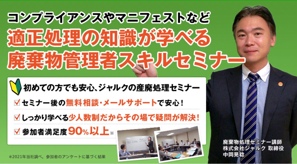 大阪堺筋本町に本社を構える株式会社ジャルクは、5月17日(金)に恒例となった「廃棄物管理のポイントがわかる!産業廃棄物処理法セミナー」を今回は無料オンラインにて開催する。