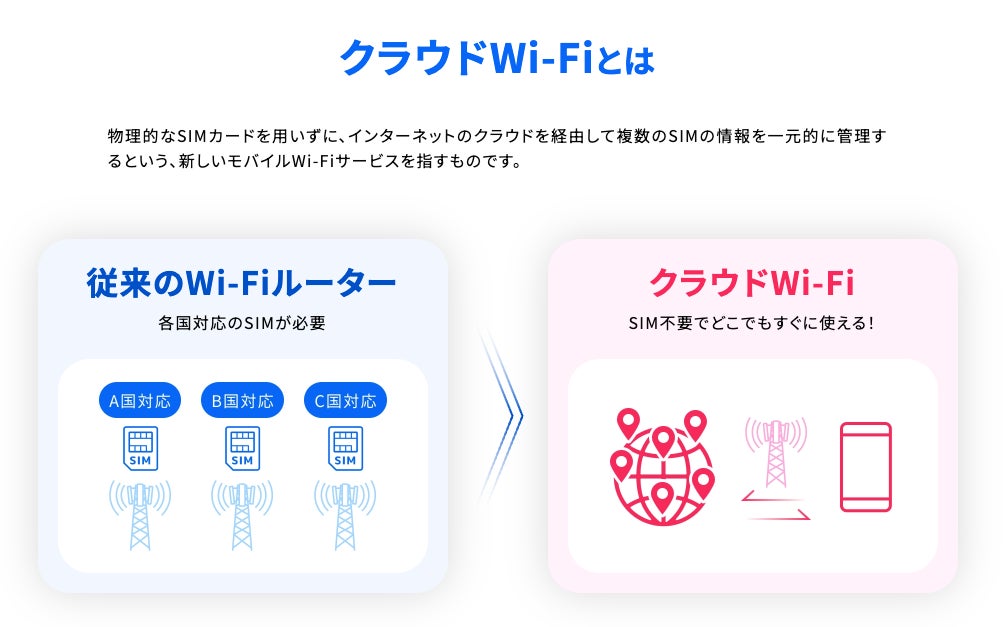 新たに提供を開始する「次世代型通信 クラウドWi-Fi」は、物理的なSIMカードを用いずに、インターネットのクラウドを経由して複数のSIMの情報を一元的に管理する、新しいタイプのモバイルWi-Fiサービスです。