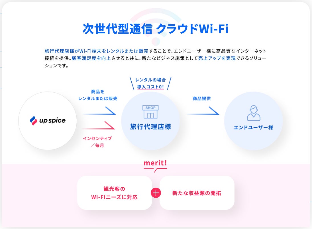 システム開発とマーケティング事業を提供する株式会社UP SPICE(代表取締役社長:谷本和隆/本社:東京都千代田区)は、旅行代理店向けの新サービス「クラウドWi-Fi」の提供を開始しました。