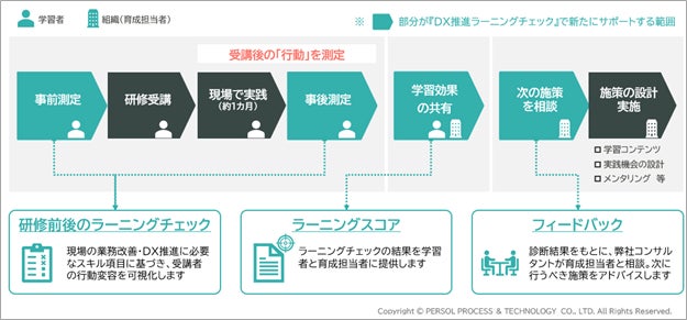 本サービスは、研修プログラムの受講前と受講後にデジタルスキルだけでなく変革スキルを重点にチェックし、ラーニングスコアとして可視化、“学んだことを現場でどの程度実践できているか”を測定します。その診断結果をもとに当社コンサルタントが人材育成担当者に対して次の施策(学習コンテンツや実践機会の設計、学習者メンタリングなど)をアドバイスすることで、企業のDX推進を実現します。