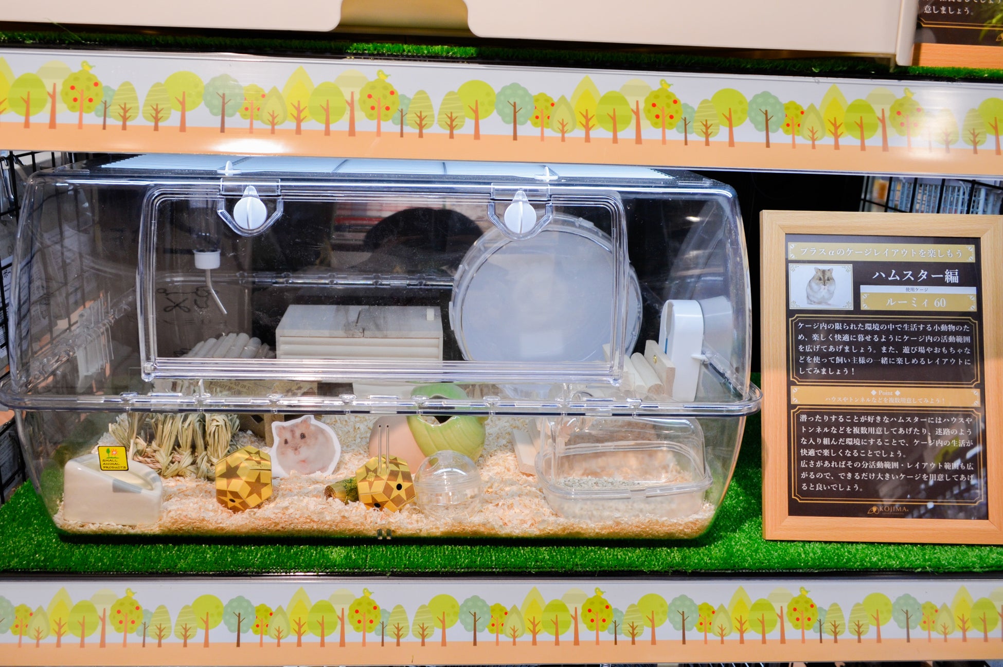 ハムスターやデグーなどが快適に暮らすために必要な大きさのケージや用品を事前に確認することができる、ケージレイアウトを再現した展示コーナーをご用意いたしましたので、新しい家族との暮らしをご検討中でもイメージしやすくなっております。