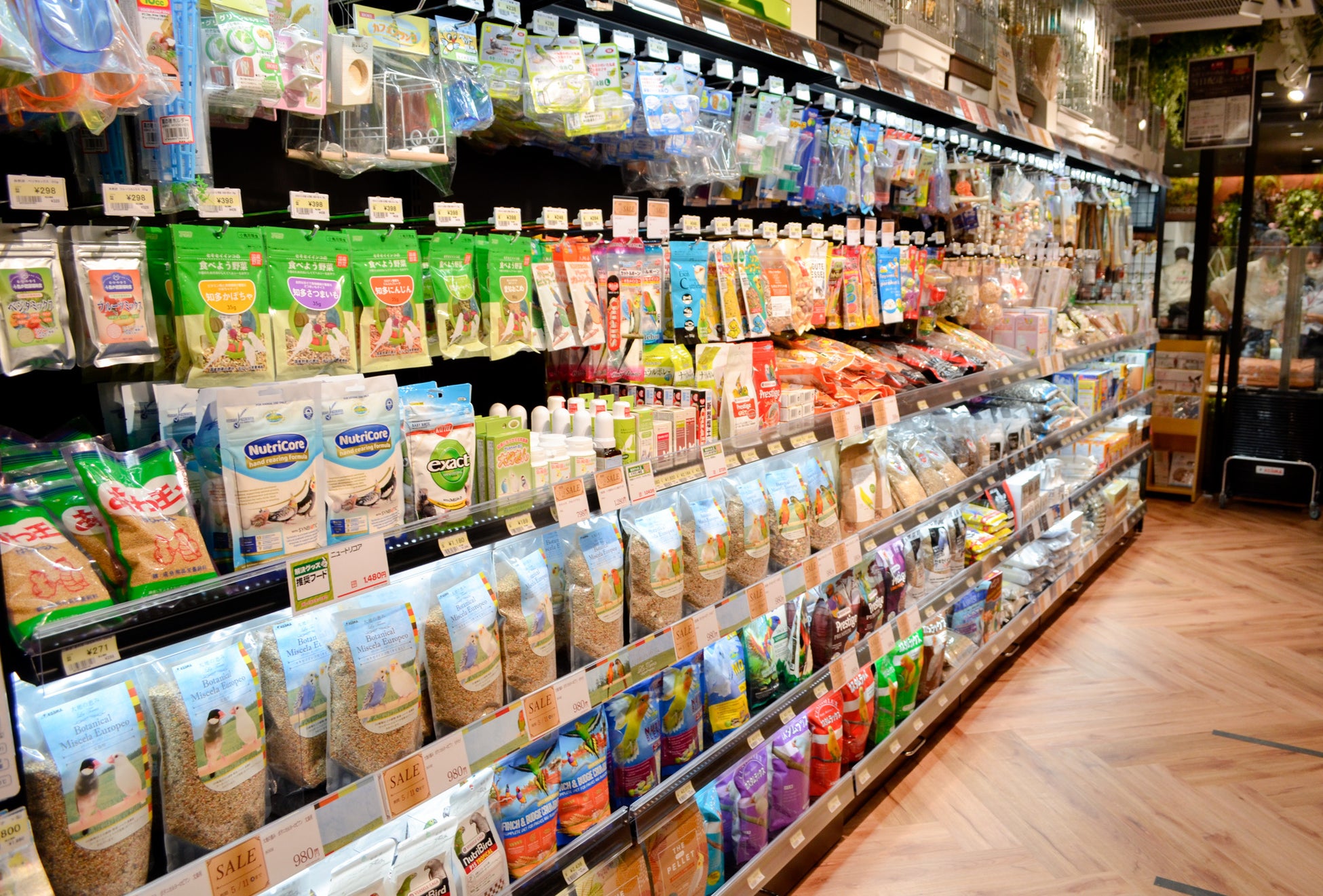 店内手前は小動物と暮らしていくのに欠かせないフードやケージなどの用品コーナーです。