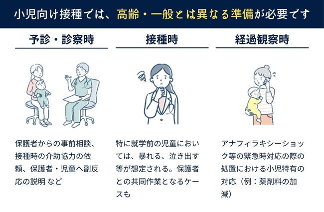 また、小児向け接種は通常の集団会場接種とは異なり、以下のような事前準備が求められます。このため小児科医師や、小児向け接種に精通した医師人材の確保が必要です。