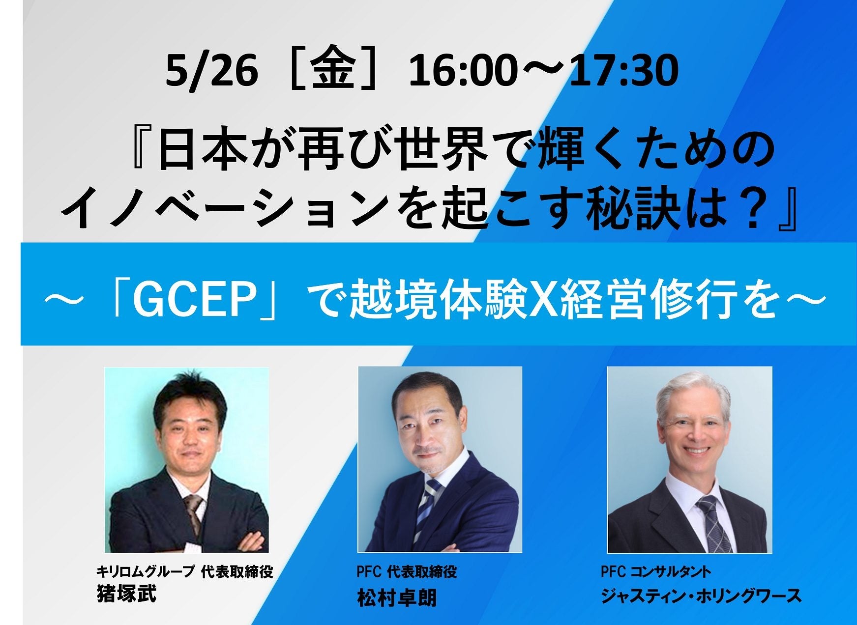 本ウェビナーでは、キリロム工科大学代表取締役・ファウンダーの猪塚武氏がイノベーションを起こす人材育成の最先端の取組みをご紹介します。また、PFCからは松村卓朗(代表取締役)とジャスティン・ホーリングワース(シニア・コンサルタント)が、イノベーションに関する日本企業の人と組織の問題などについての解を提示しながら、「海外での経営修行」がいかに「イノベーションを生む人材育成」に資するかについてお話しします。