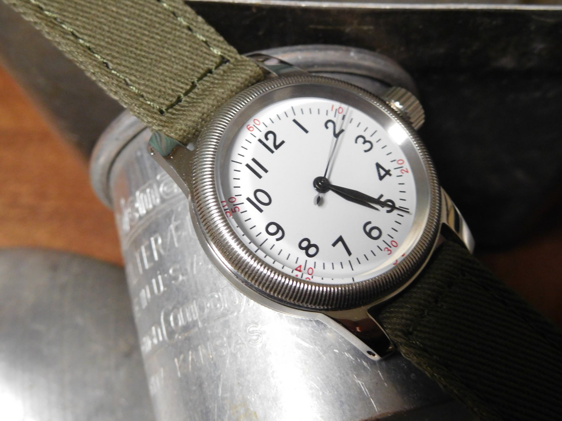 陸軍航空隊(U.S.Army Air Corps)に支給されたタイプA-11の初期型ホワイトダイアルです。1940年に標準装備品としてパイロットに配布されました。ホワイトダイアルは1942年頃までです。ブラックダイアルのタイプと比べ、圧倒的に数が少なく、レアモデルの復刻になります。