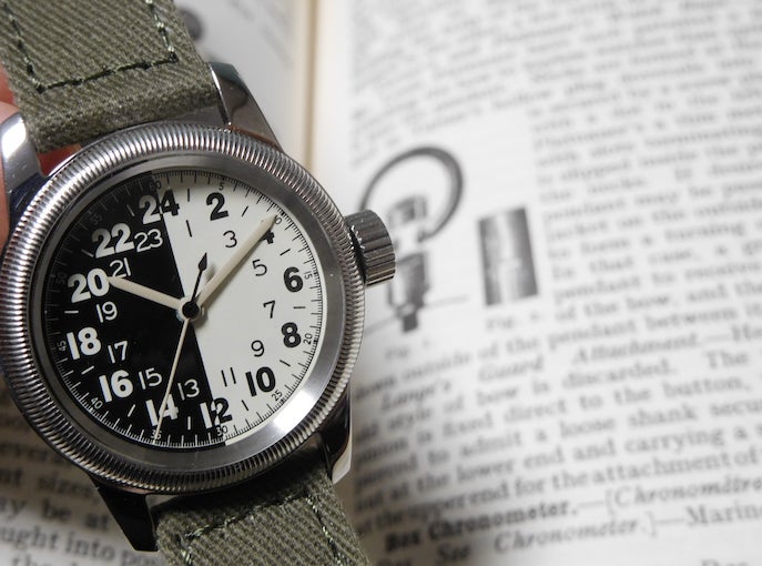 ナイト&デイの白黒の2トーンに塗り分けられた文字盤が、TYPE A-17a。今やエルジン社の傑作ミリタリーウオッチとまで云われる様になったのは、24時間の特徴を生かして、24時、12時を境に白黒と色分けられた視認性の高いデザインが起因しています。