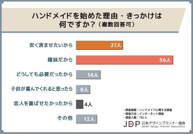 そこで今回、ハンドメイドマイスター認定試験(https://www.designshikaku.net/handmade/craft/)を主催する日本デザインプランナー協会(https://www.designshikaku.net/)は、全国の男女103名を対象に「ハンドメイドへの興味と実際の経験」に関するアンケートを実施しました。