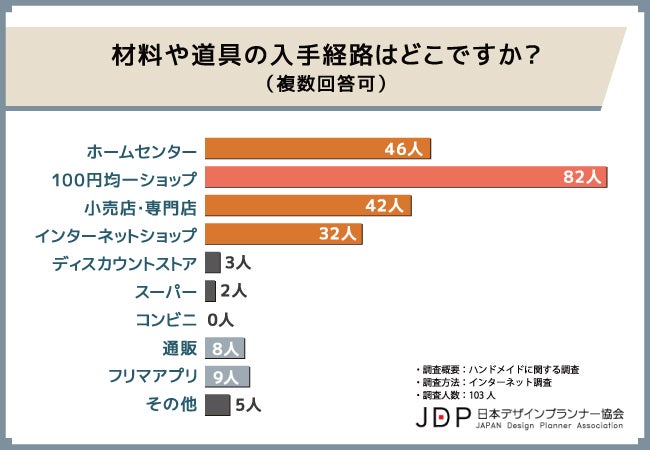 材料や道具の入手経路で最も多かったのは「100円均一ショップ」という結果に