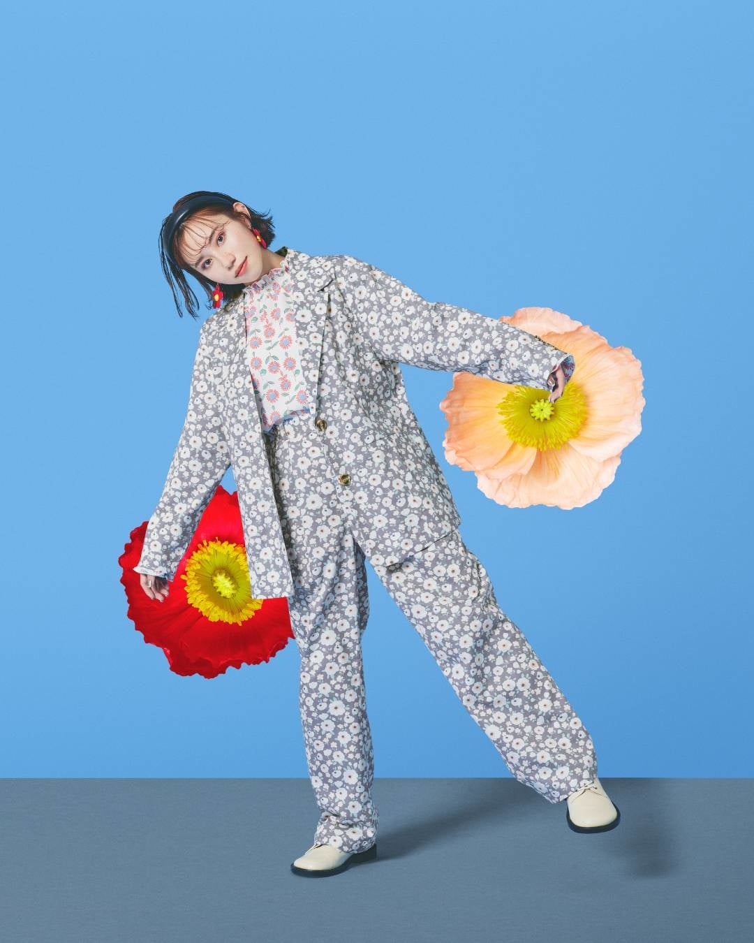 大人っぽさと可愛さの両取りが叶うパープルの花柄セットアップは、パンツルックで甘えさを抑えつつ、中に着たカットソーの赤い花柄と裾のフリルが顔周りを華やかに演出。