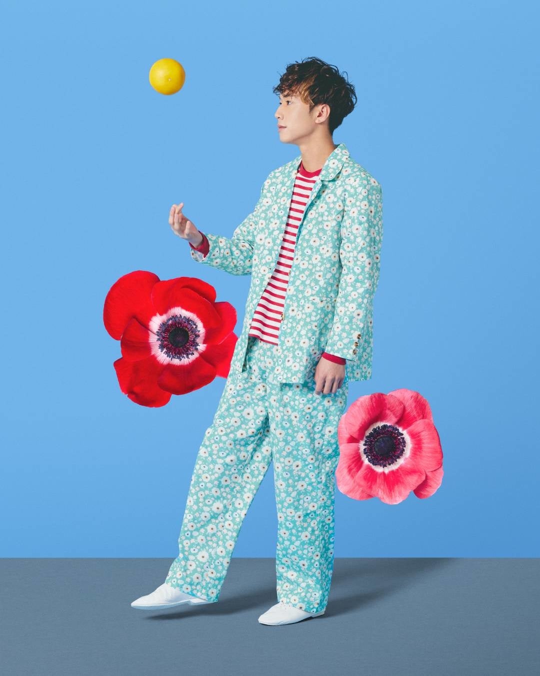 ブルーの花柄セットアップを、赤×白のボーダーでカジュアルに着崩した、ユニセックスで楽しめるコーディネート。中に着るアイテム次第でいろんな着こなしが楽しめます。