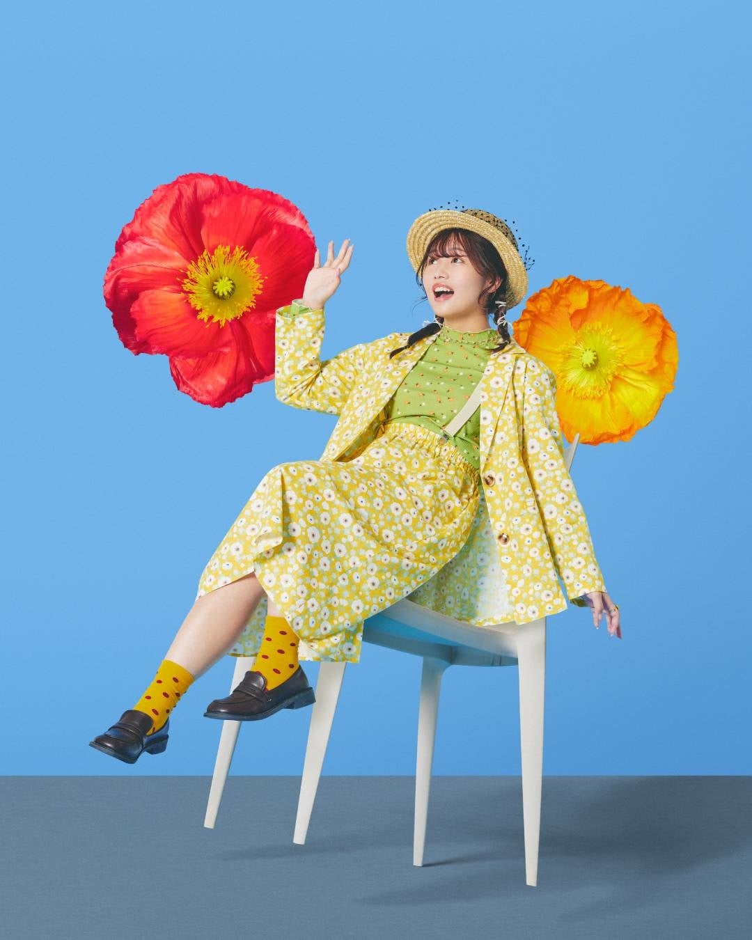 ハッピーなムード満載のイエローの花柄ジャケット&フレアスカートのセットアップに、