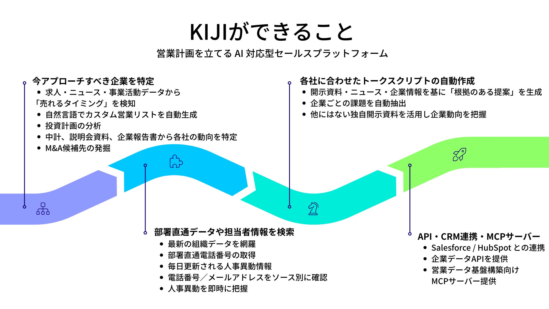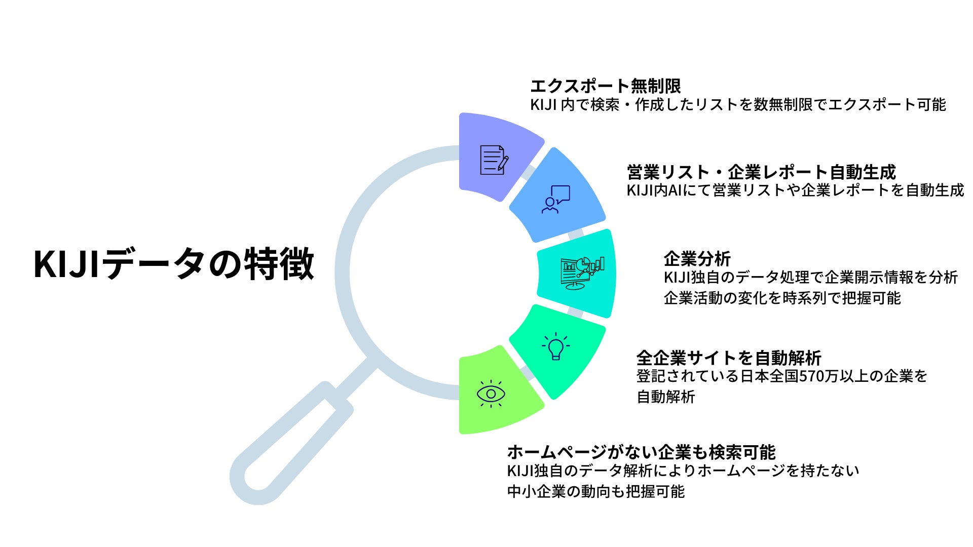 「KIJI」は企業活動の変化を時系列で把握できるUI、ユーザー主導での柔軟な分析、元データへ遡れる透明性を特徴とし、ビジネス現場の意思決定を直接支援する非財務データインフラとしてご活用いただけます。