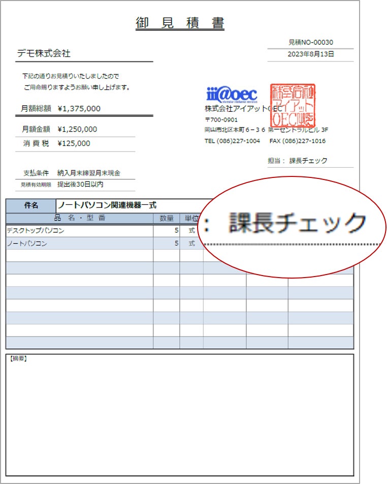 またステータス状況を帳票出力出来るようになったため、確実に決裁が終わっている見積なのか等の信頼性を付与する事が出来るようになりました。