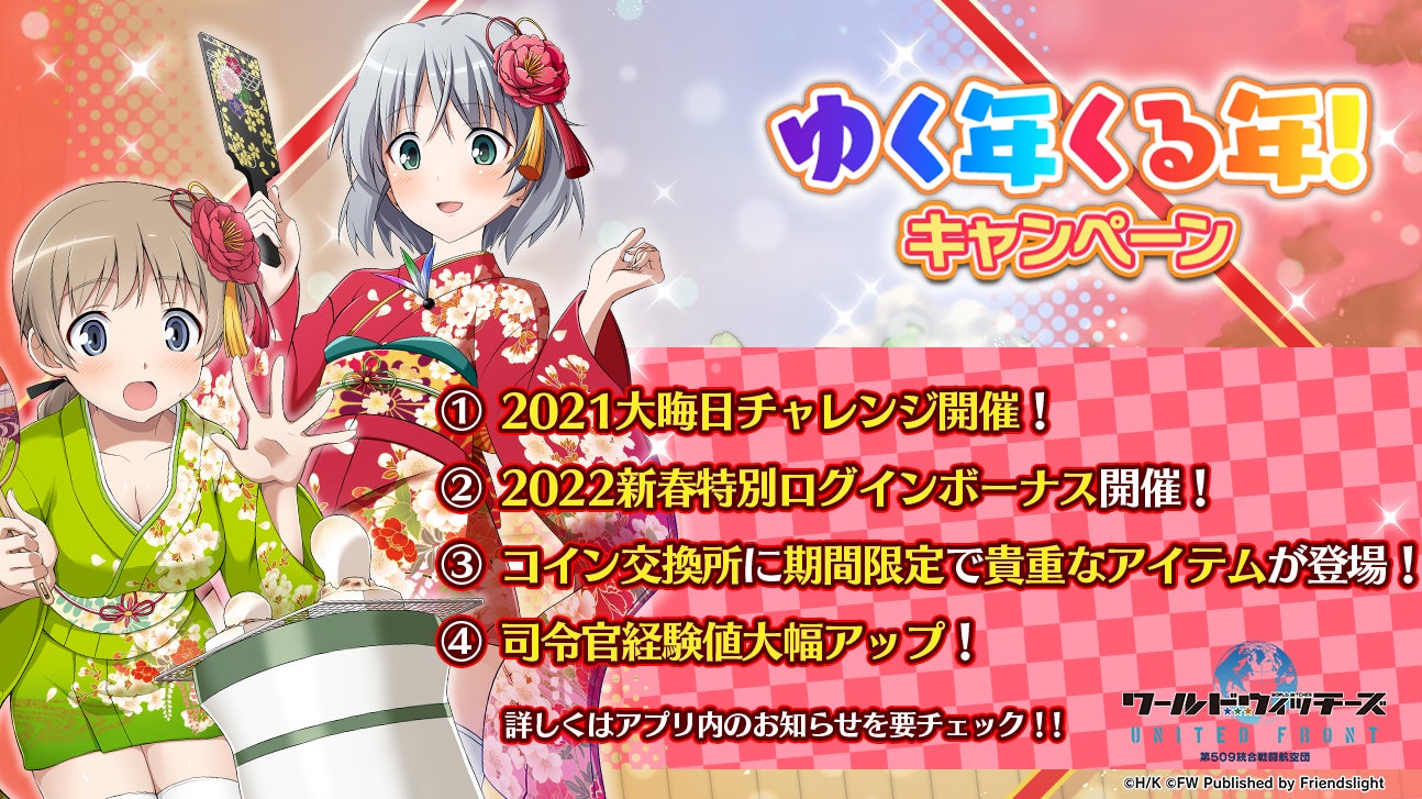 株式会社フレンズライトは、運営開発を行っているスマートフォン向けゲームアプリ『ワールドウィッチーズ UNITED FRONT』(以下、『ユナフロ』)にて、2021年12月28日(火)メンテナンス後より様々なイベントを開催いたします。