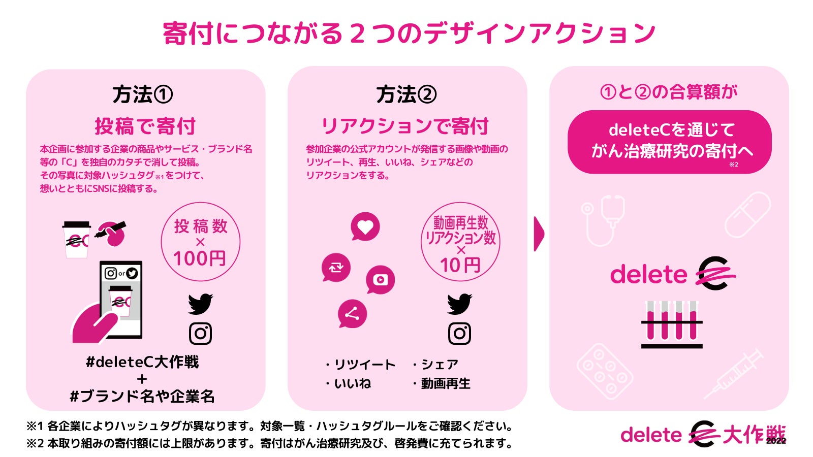 「#deleteC大作戦」は、参加企業の商品パッケージやロゴから、「Cancer(がん)」の頭文字でもある「C」を消した画像や動画をSNSへ投稿することにより100円が、がん治療研究への寄付に繋がるソーシャルアクションです。また、参加企業の公式アカウントが発信する画像や動画に反応(いいね、動画再生、シェア、リツイート)すると、1反応あたり10円が、がん治療研究へ寄付されます。