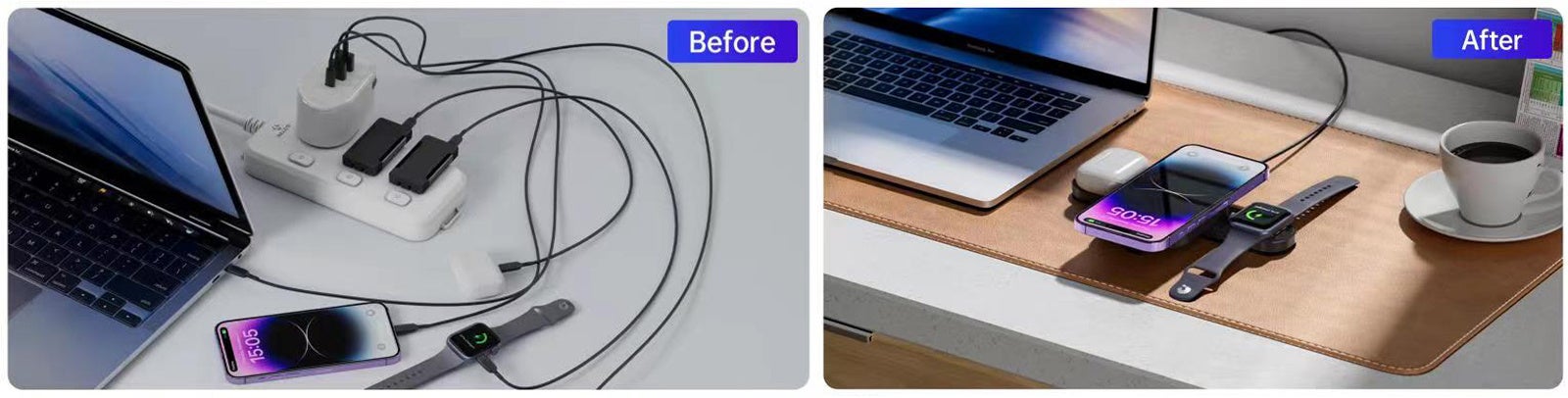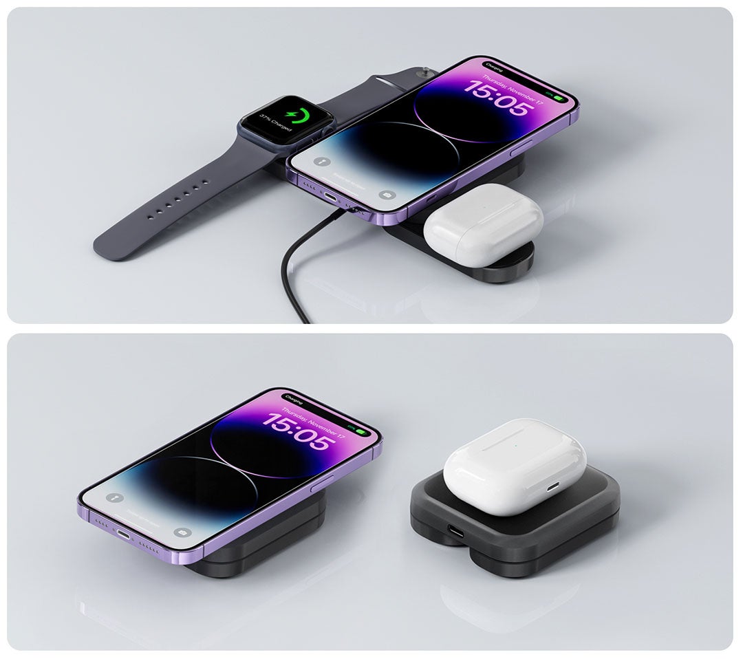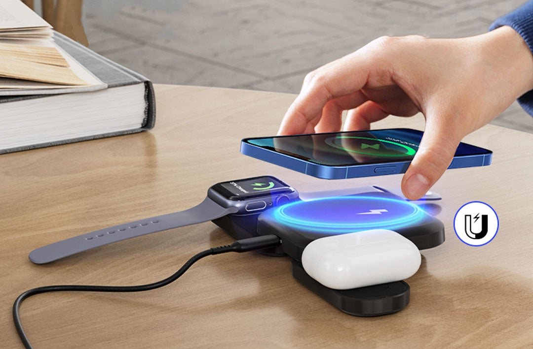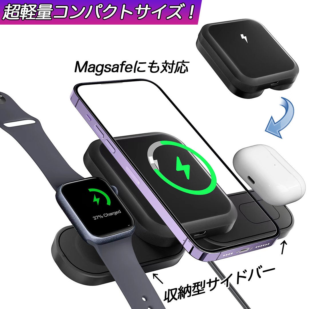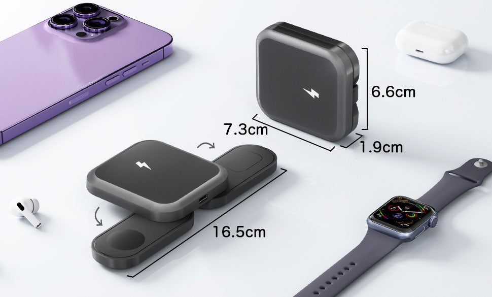 スマートホン、アップルウォッチ、ワイヤレスイヤホンを同時に楽々充電!他に専用充電器は必要なし!