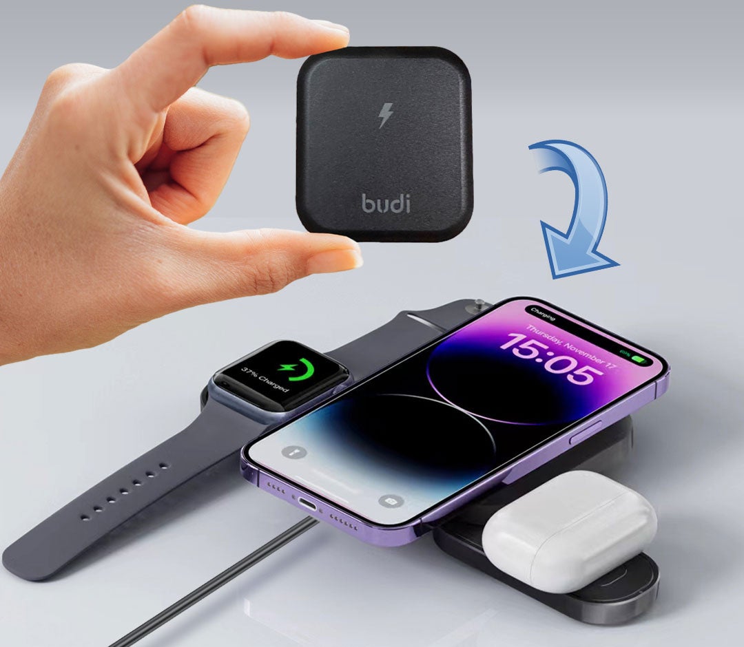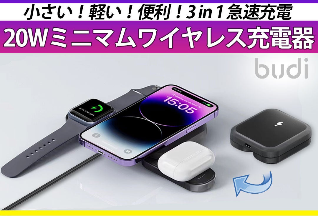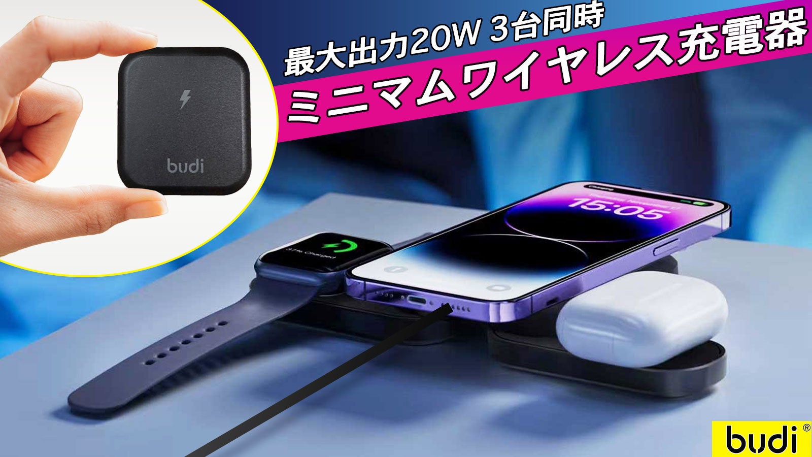 極小!軽量!簡単便利!このサイズ感でスマホ、アップルウォッチ、ワイヤレスイヤホンの3台同時急速充電が可能、MagSafeにも対応した充電器の傑作!budi「20Wミニマムワイヤレス充電器」新登場です!
