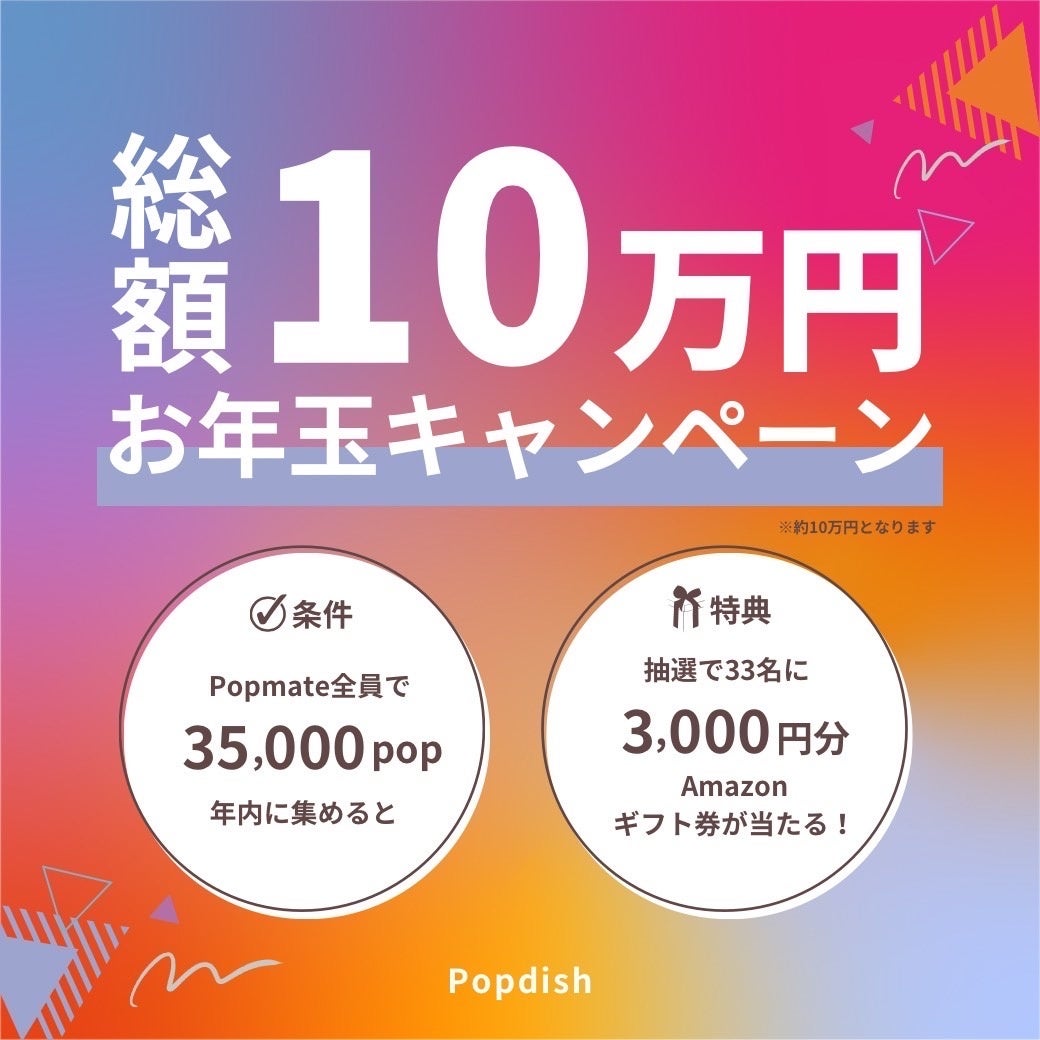 Popdishでは、2023年11月26日〜2023年12月31日の期間に、Popmate全員で35,000popを集めると、期間中に動画を投稿してくれたPopmateの中から、抽選で30名様に3,000円分のAmazonギフト券(登録メールにURL送付)をプレゼント。
