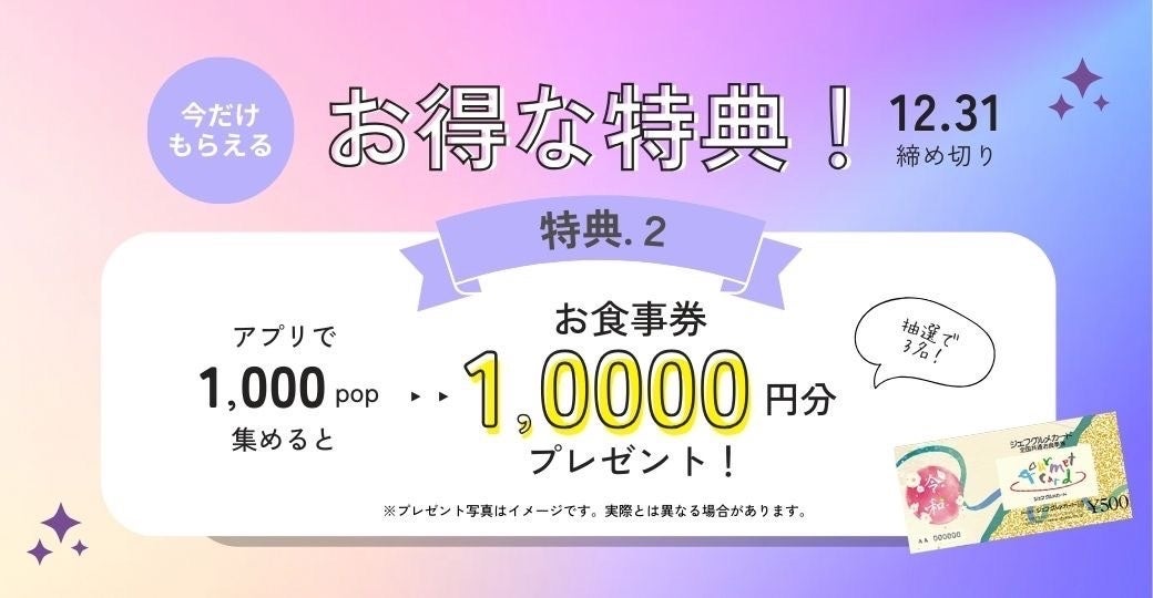 Popdishでは、2023年11月1日〜2023年12月31日の期間に、3件以上の飲食店のグルメ動画を投稿してくれたPopmateの中から、抽選で3名様に10,000円のお食事券(ジェフグルメカード)をプレゼント。