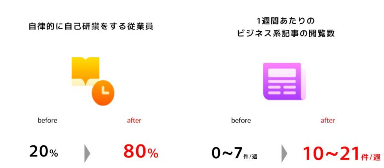・上司から見ても、部下が読んだ記事の内容について意見交換したり、読んだ記事のジャンルによって貸す本の種類をより今の課題や求めているものに合わせて貸せるようになった。