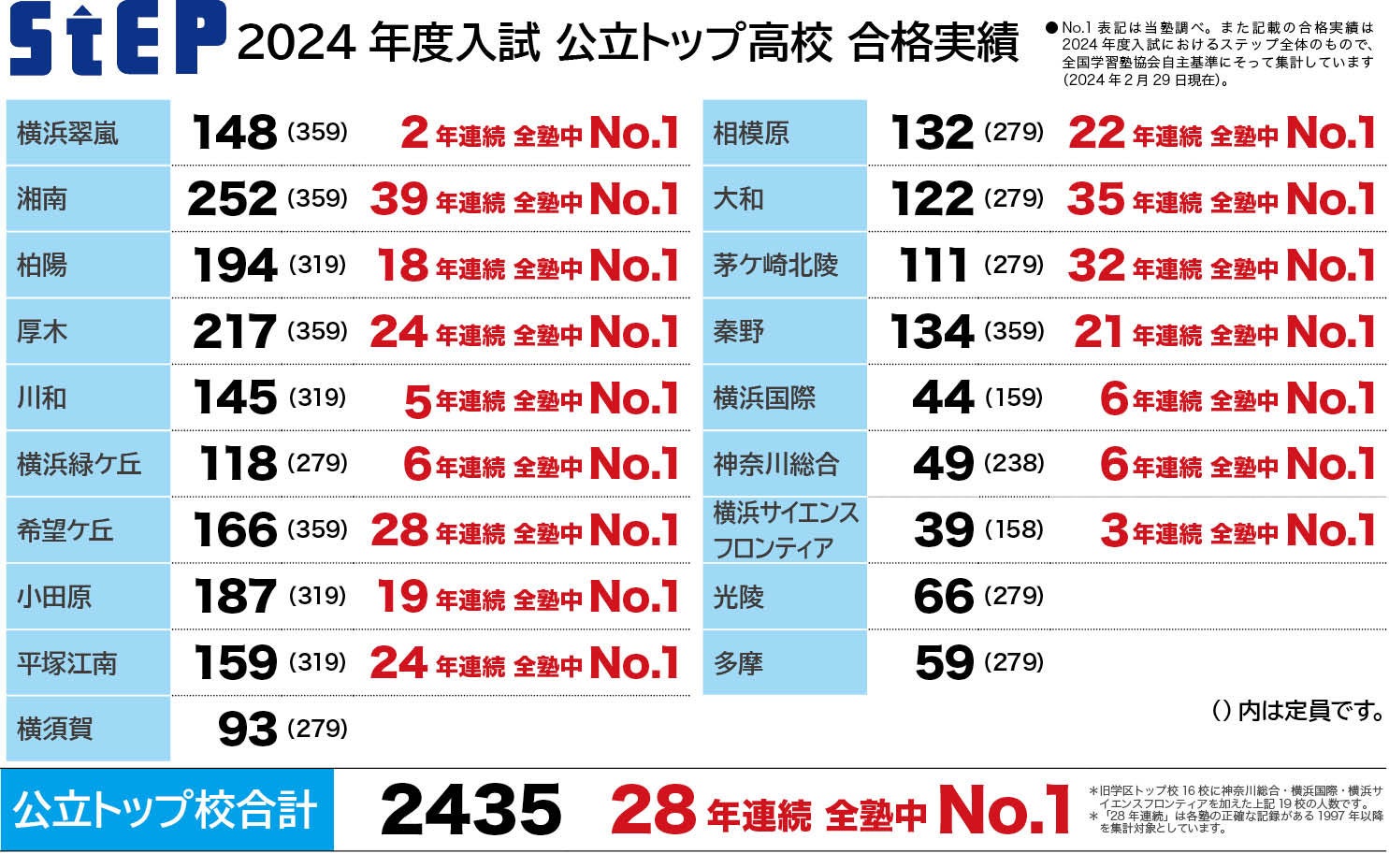 学習塾ステップ、2024年度神奈川県公立高校入試でトップ校19校に2,435名合格