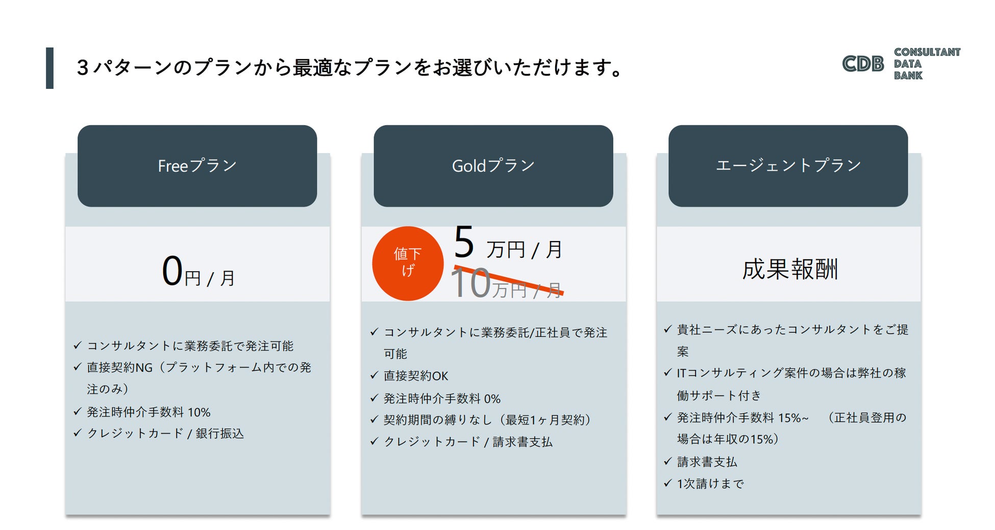 コンサルデータバンクでは、従来月額10万円(税込)であったGoldプランをリニューアルし、月額5万円(税込)で提供を開始します。