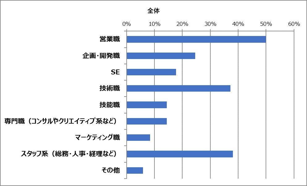 最も回答が多かった職種が「営業職」で50%でした。次いで、「スタッフ系(総務・人事・経理など)」が38%、「技術職」が37%でした。営業パーソンのレジリエンス強化が課題であることが分かりました。