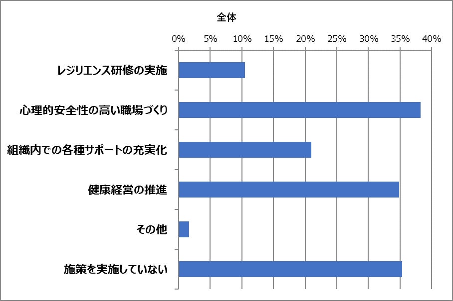 行っている施策として最も多いのが、「心理的安全性の高い職場づくり」で38%でした。次いで、「健康経営の推進」で35%でした。「レジリエンス研修の実施」は11%にとどまりました。