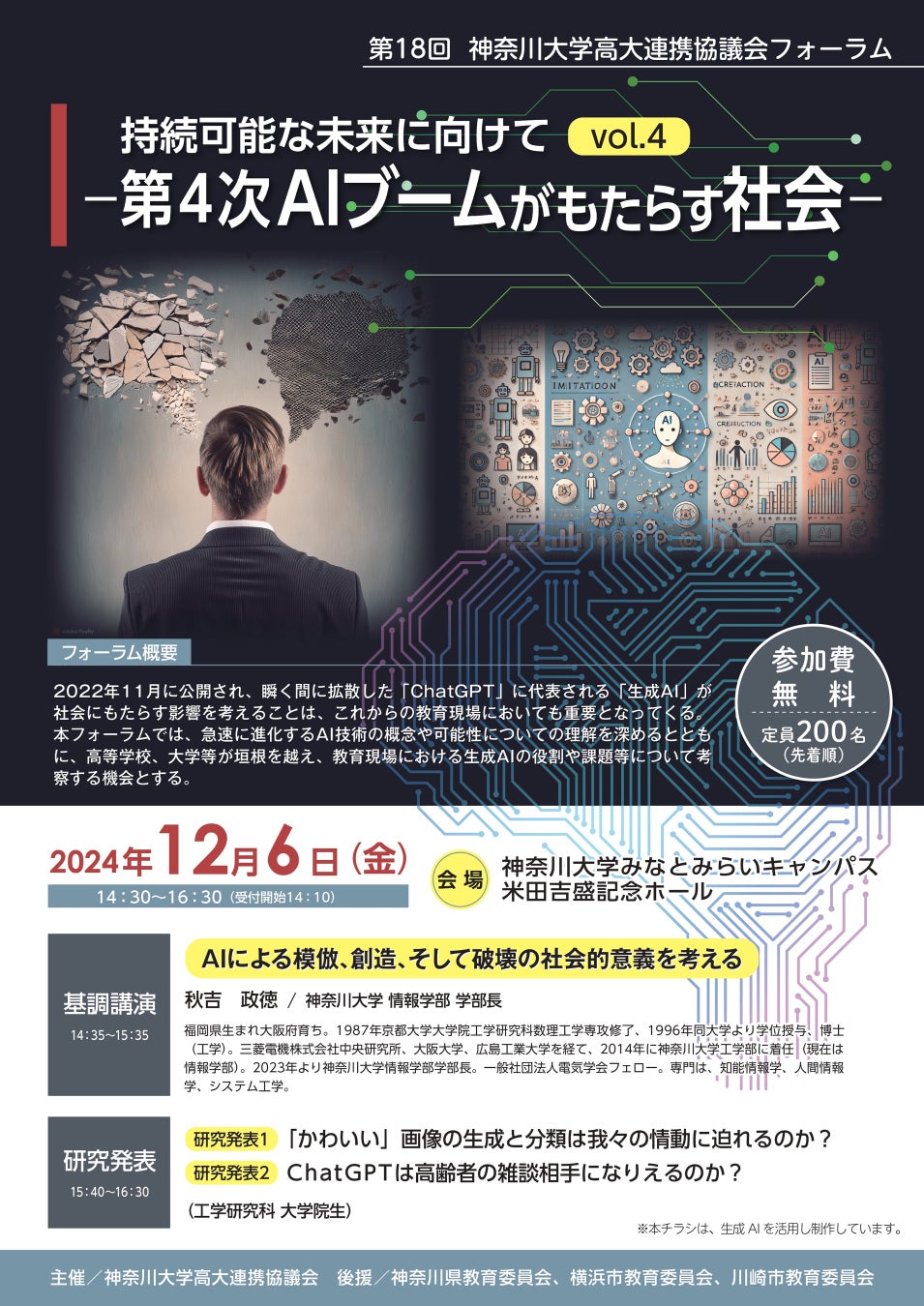 神奈川大学では12月6日(金)に「持続可能な未来に向けて~第4次AIブームがもたらす社会~」と題した第18回神奈川大学高大連携協議会フォーラムを開催します。基調講演と研究発表をとおし、急速に進化するAI技術の概念や可能性についての理解を深めるとともに、教育現場における生成AIの役割や課題等について考察する機会とします。