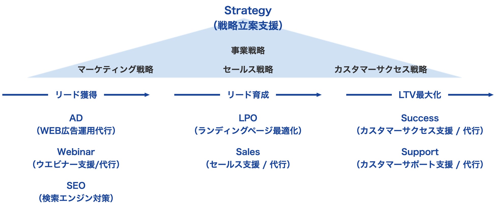 BtoBの事業領域において顧客が抱える課題を解決すべく、リード獲得からLTV最大化まで一気通貫で支援いたします。