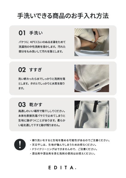 新型のウイルスが世界的に流行し、様々な新しい生活様式が生まれていく中、私たちにも何か世の中の為に役立てる事はないかと模索したところ、衣類やマスクを洗濯する事と同様にバッグも洗う事は出来ないかと考えました。そこで、水と相性のいい「ウェットスーツ」に使用する「ネオプレン生地」と、「ランニングシューズ」に使用する「メッシュ生地」を軸にEDITA(エディータ)を展開する事を決定しました。当ブランドでは、電車やバス、飲食店、職場などの外気に常に触れている日常使いのバッグを、「洗う」という新しい価値として提案しています。