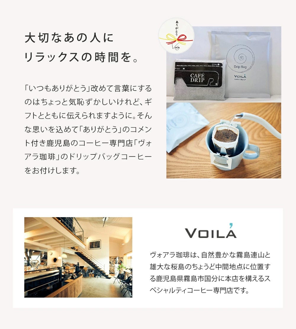 期間中はプチギフト付ラッピングを承います。ありがとうのコメント付きコーヒー専門店「ヴォアラ珈琲」のドリップコーヒー1袋をお付けします。