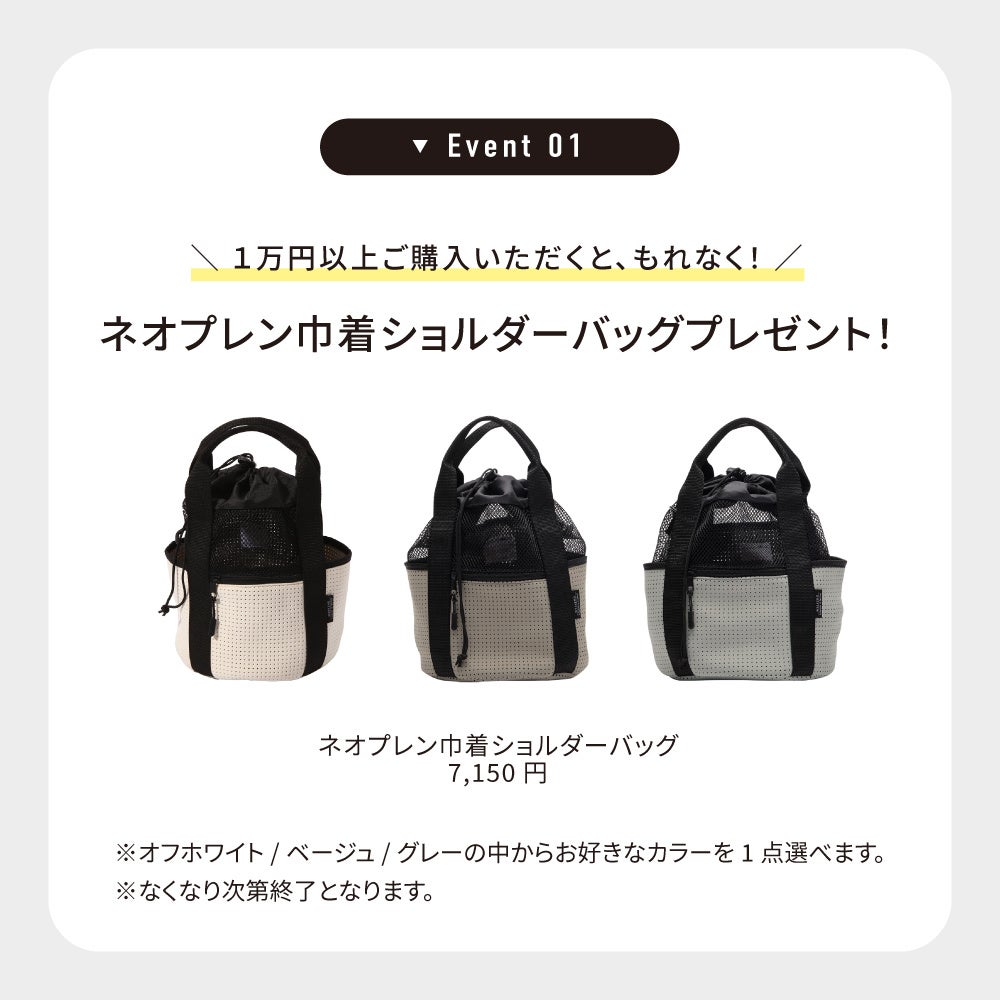 1. 税込1万円以上購入のお客様限定で、当店人気アイテムのバッグをプレゼント(通常価格 税込7,150円)。※数量限定となります。