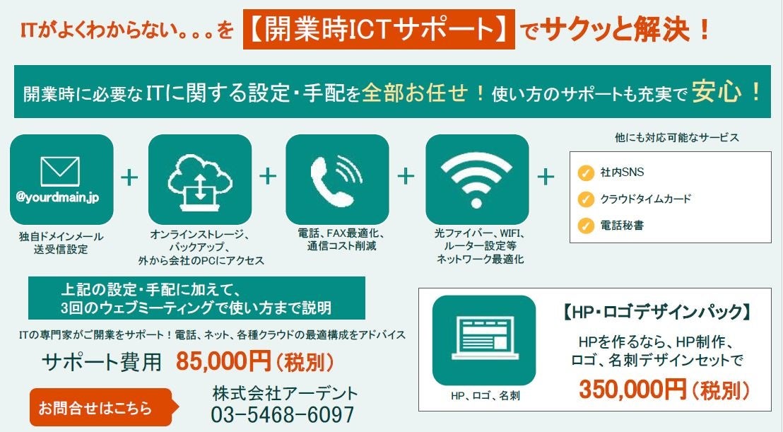 各種クラウドサービスの販売・ICT活用コンサルティングを行っている株式会社アーデント(本社:東京都渋谷区、代表:渡邊賢)は、開業する人で、特にITに詳しくない人を対象にITサポートサービス「開業時ICTサポート(https://ardent.jp/service/startup-ict/)」の提供を開始しました。