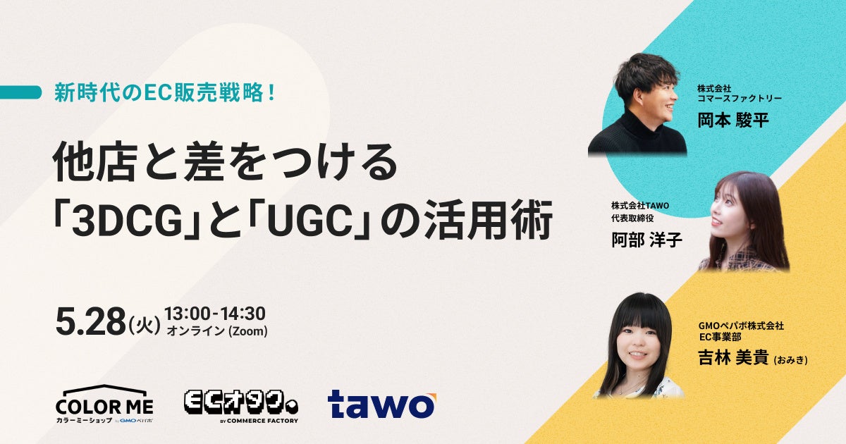 株式会社TAWO(本社:東京都港区、代表:阿部 洋子)は、2024年5月28日(火)13:00〜にオンラインにて「他店と差をつける"3DCG"と"UGC"の活用術」を開催いたします。