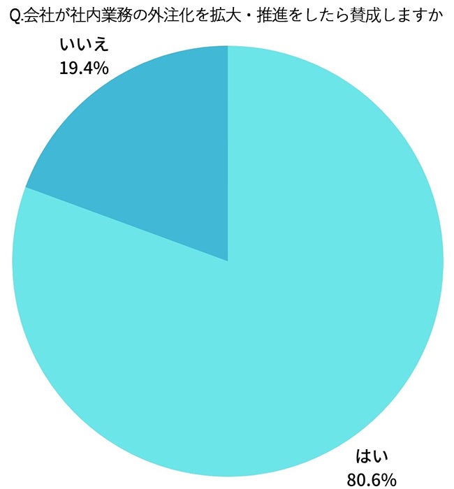 「会社が社内業務の外注化を拡大・推進したら賛成しますか」という質問には、「はい」と回答した方が80.6%、「いいえ」が19.4%という結果になり、社内業務の外注化拡大を望む人が8割もいることがわかりました。