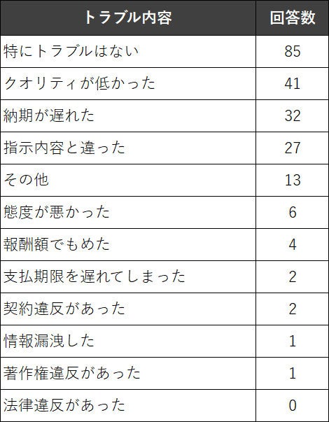 「特にトラブルはない」という回答が一番多かったものの、「クオリティ」と「納期」に関するトラブルが多い結果となりました。