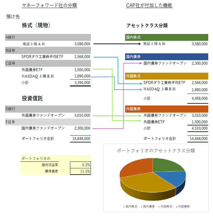 株式会社キャピタル・アセット・プランニング(本社:大阪府北区、代表取締役社長:北山雅一、証券コード3965、以下:当社)は、株式会社マネーフォワード(本社:東京都港区、代表取締役社長CEO:辻庸介、証券コード3994、以下マネーフォワード社)が提供するAPIサービスでの連携により、個人が保有する複数の金融機関の預貯金、個別株式、投資信託データを取得※し、詳細に分析・カテゴライズした後、当社がクラウド上で展開する統合資産管理システム「Wealth Management Workstation」に自動的にセットし、個人の総資産に係わる分析をより効率的に可能とするサービスを開始いたします。