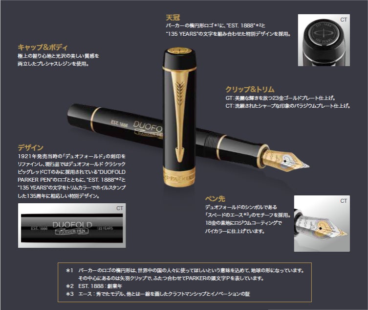 ニューウェルブランズ・ジャパン合同会社(住所:東京都港区芝浦4丁目9番地25号、職務執行者: ショーン・チャールズ・ベックストローム)が展開する、高級筆記具ブランドPARKER(パーカー)は、創業から135年を記念する特別モデル、「デュオフォールド135 スペシャルエディション」を発売します。また一部の販売店限定で、135周年特別プロモーションを実施いたします。