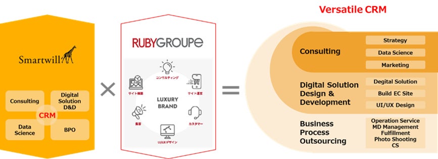 このたび、ラグジュアリーブランドという共通のクライアントカテゴリーを持つスマートウィルとルビー・グループがタッグを組み、強みを相互補完しあうことで、顧客企業の業績貢献に直結する「コンサルティング~システムインテグレーション~BPO」を一気通貫で提供し、ラグジュアリーブランドの屋台骨となる事業フレームワークを構築、サポートすることが可能となります。