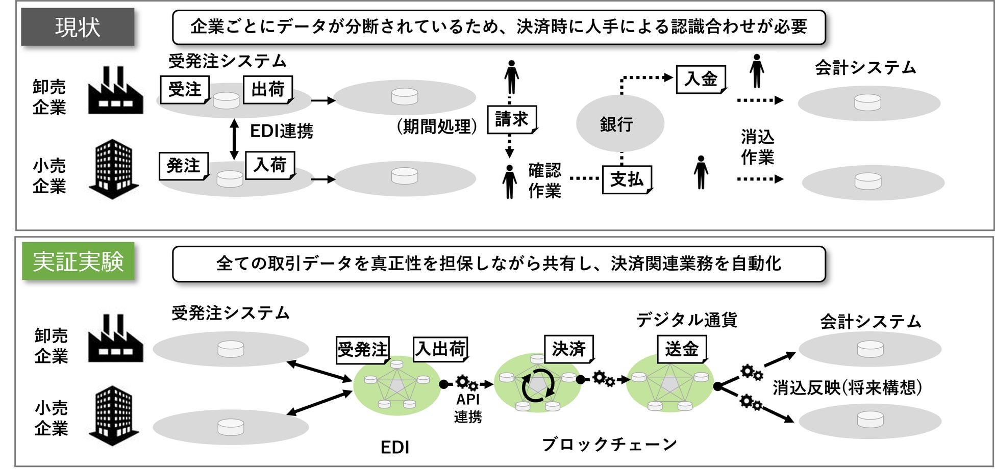 本実証実験は、商取引のデジタル完結による業務効率の効果を定量的に検証するとともに、連携環境を構築・活用する上での技術的な知見を蓄積することを狙いとして実施するもので、商流から金流への流れを自動化するデジタル通貨の有用性の確認や、その基本機能の検証、技術的課題の整理などを行います。