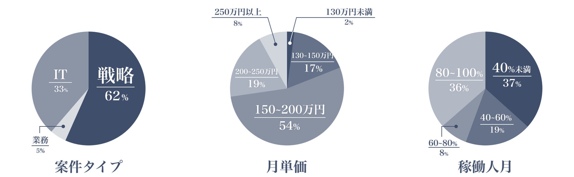 - [稼働人月] “副業”向けの4割未満稼働、もしくは”フリー・ブティックファーム”向けの8割以上稼働の案件が中心