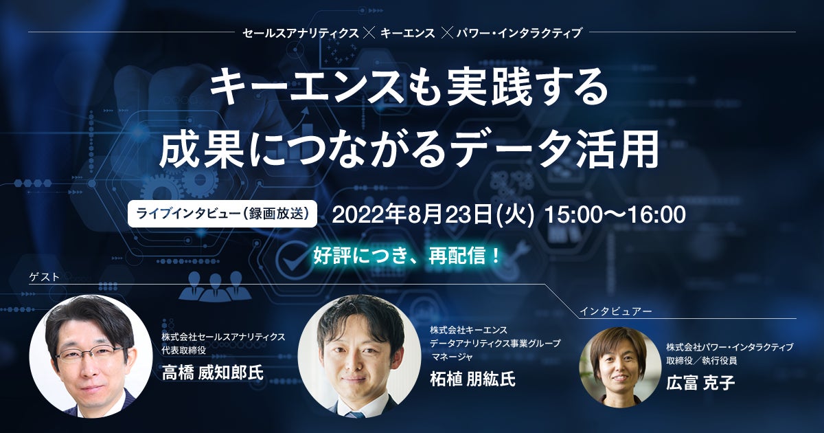 株式会社パワー・インタラクティブは、株式会社セールスアナリティクス代表の高橋様と株式会社キーエンスの柘植様をお招きした、無料ウェビナー『キーエンスも実践する成果につながるデータ活用』を、8月23日に再配信します。